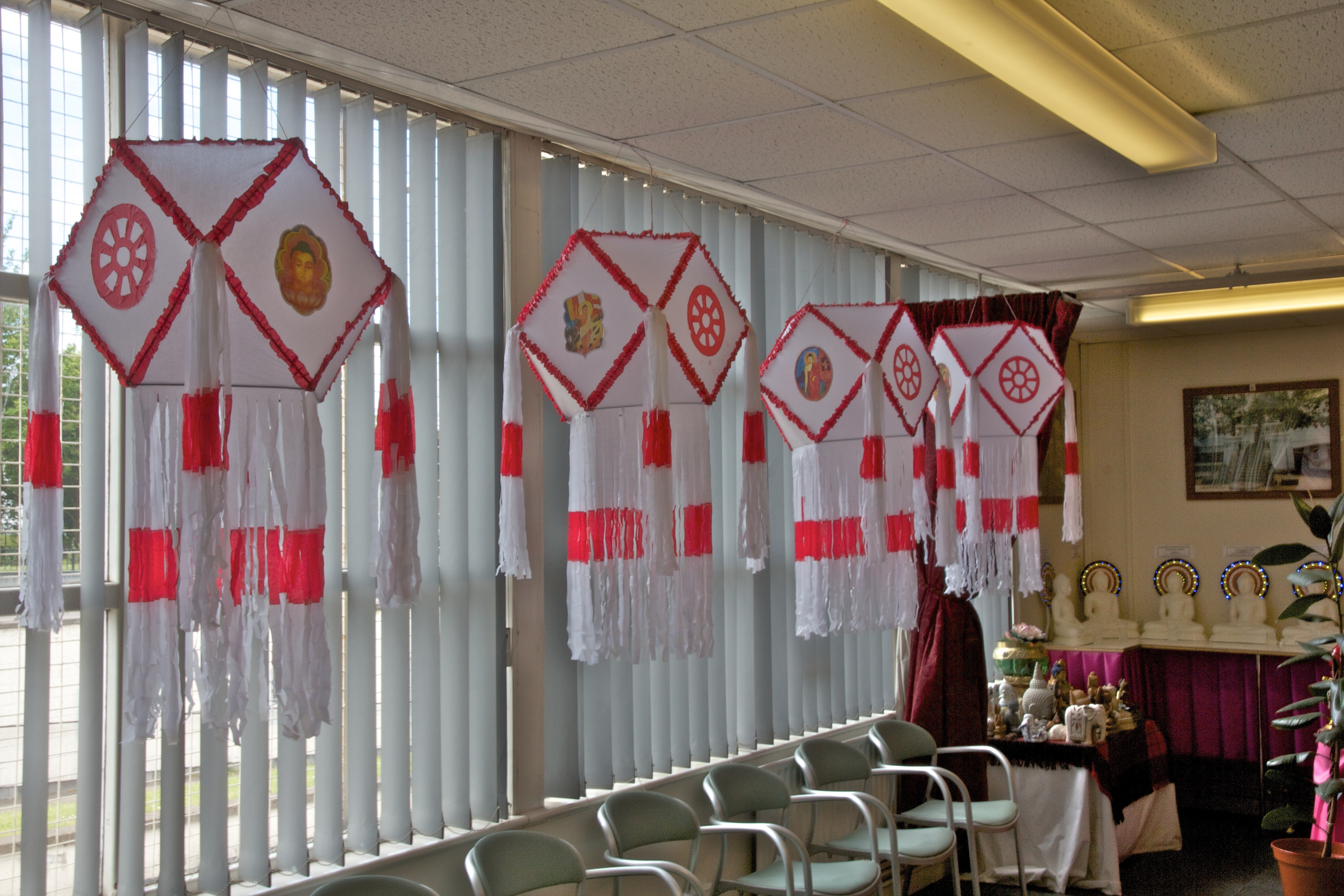 Previous Image Next Image Window Decorations Decorations in the Ladwood Pagoda. The illustrations of the prayer wheel and Buddha are intended to signify and inspire devotion. Like Loading...
