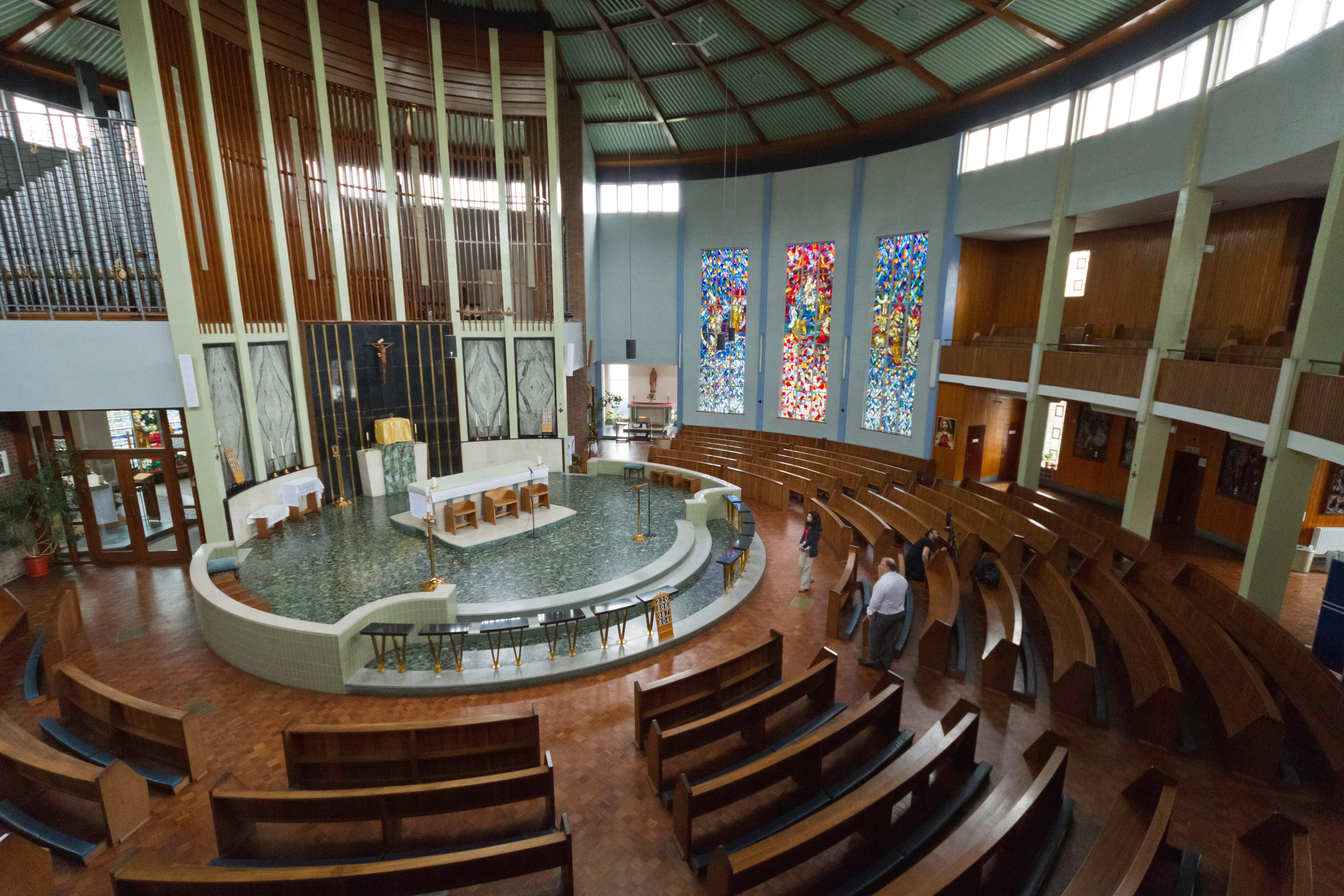 The altar and seating in Catherine of Sienna Roman Catholic church, central Birmingham. In common with all Roman Catholic churches built in the mid to late 1960s it is “in the round”. This is because it was decided by the Vatican II church council that the Roman Catholic church as an organisation should be more and inclusive of ordinary believers and allow all to participate in services on equal terms.