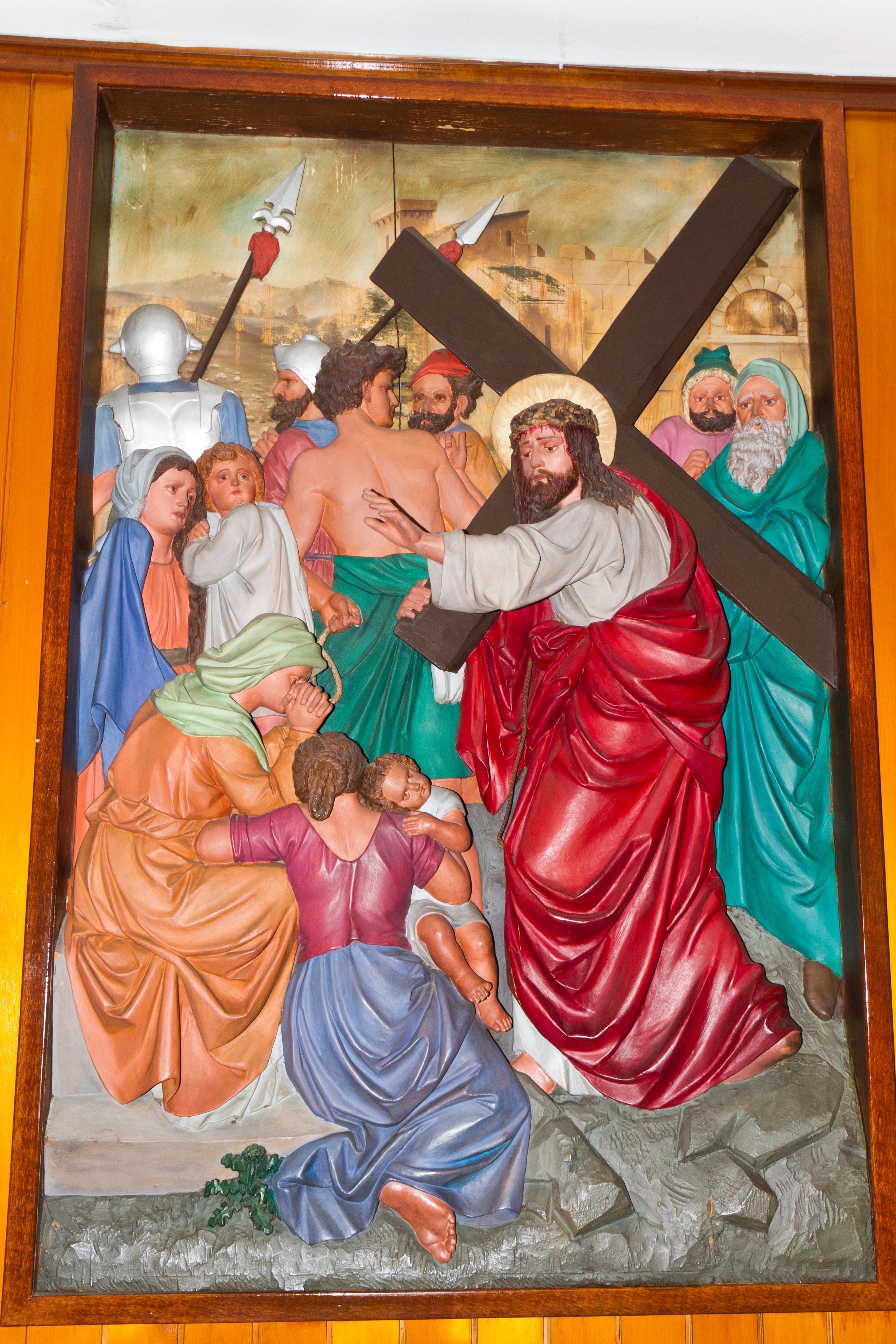 Modern Painted images showing Jesus’ progress to Calvary (where he was executed). They are found on the walls of the St. Catherine of Sienna Church in Birmingham.