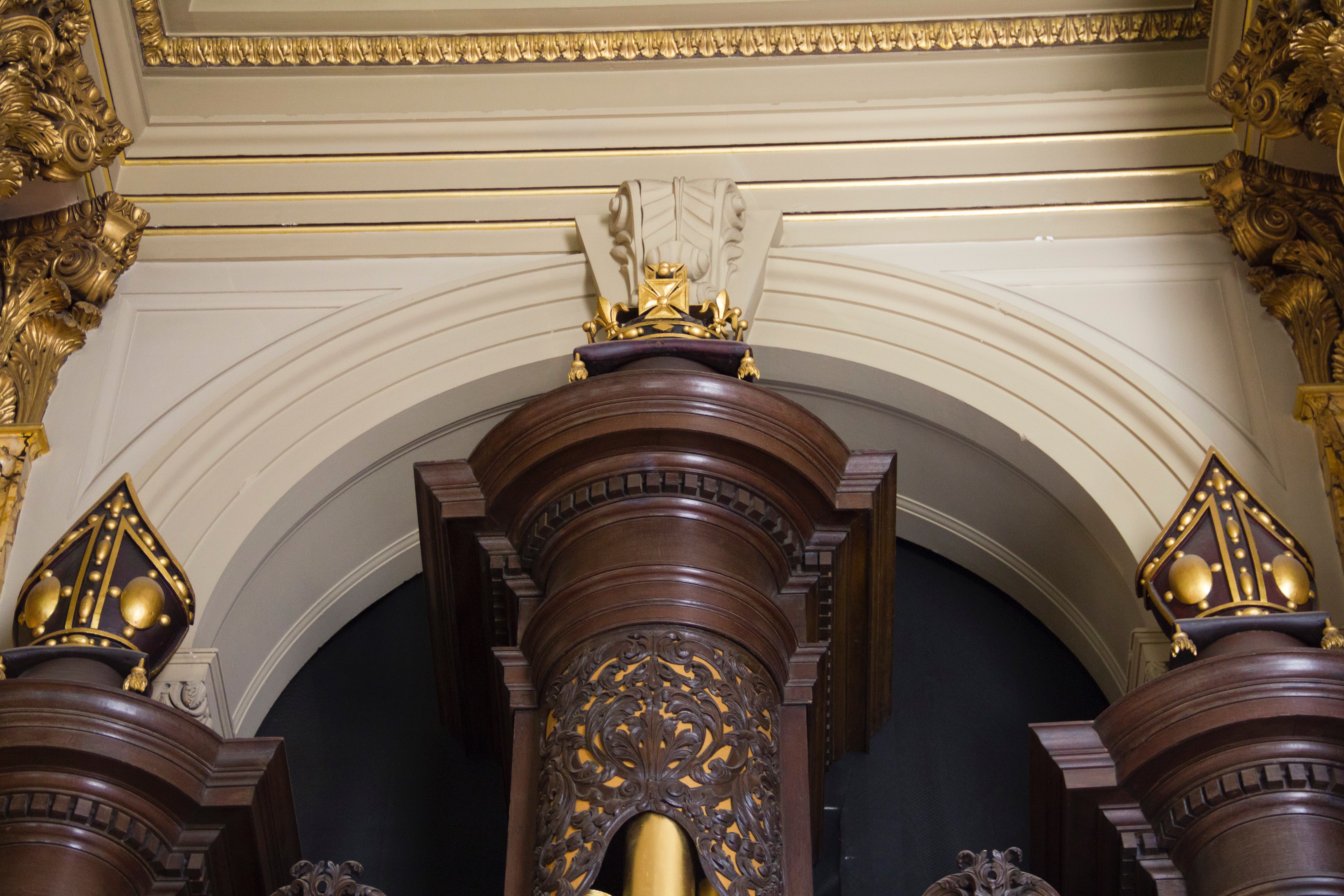 Sitting high above the organ at St. Philip’s Cathedral, Birmingham, these carvings say something about the important of both secular and religious authority within the Church of England. The crown symbolises the role of the monarch (and by extension Parliament and the state) in the running of what is the UK’s official religion. The bishop’s hats flanking it represent the importance of the clergy, church hierarchy and religious scholarship in the spiritual government and leader of the church.