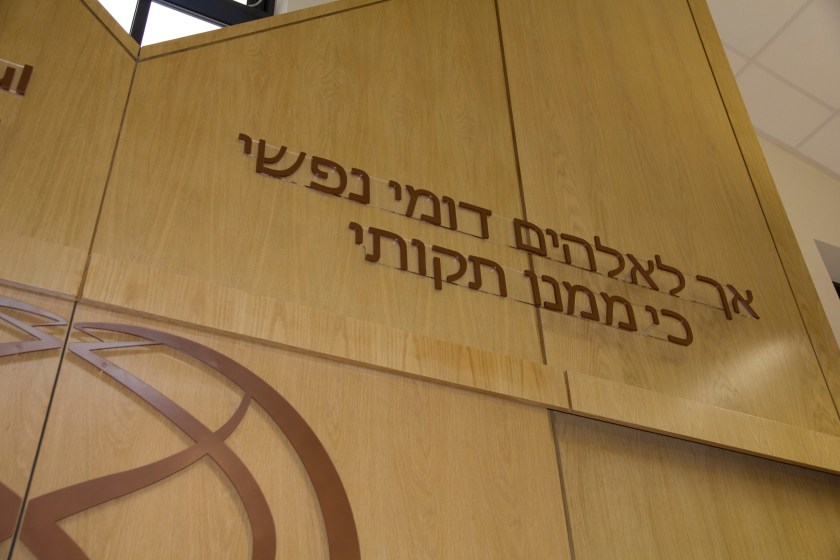 Previous Image Next Image Prayer on a Synagogues Wall in Hebrew A sacred phrase intended to help worshipers reflect. It is also written in English on the other side of the sanctuary. Like Loading...