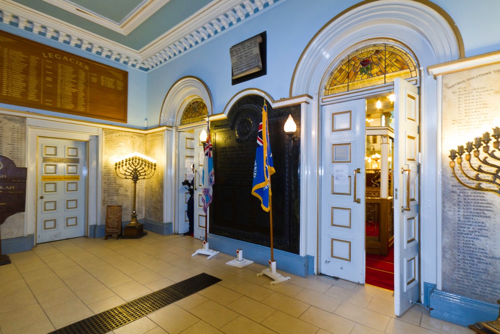 The entrance hall to Singers Hill synagogue in central Birmingham. Note the war memorial to those from the community who died in World War I alongside traditional Jewish religious artifacts like the Menorah.